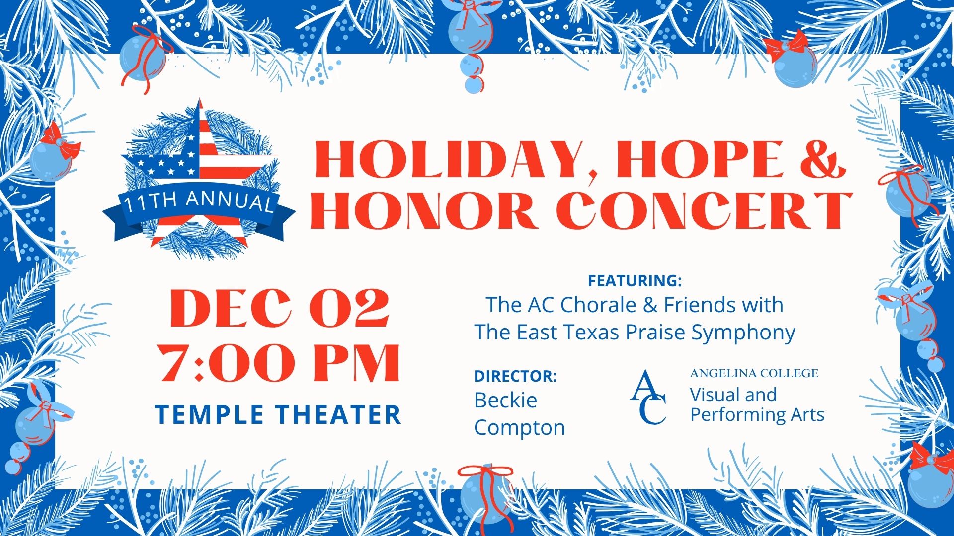 Join the AC Chorale & Friends for our 11th annual holiday concert honoring our veterans USO-style! Special guests include The East Texas Praise Symphony, Chorale alumni, and local childrenÕs ensembles. Directed by Beckie Compton. Emcee is Gary Stallard.