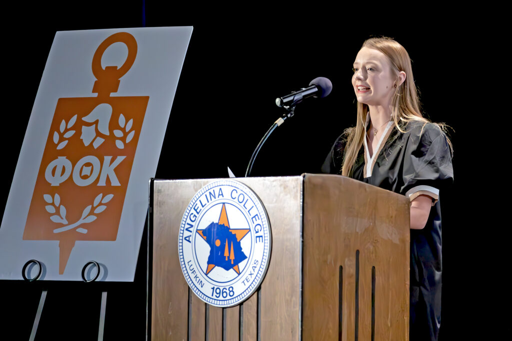 Guest speaker Madi Stott addresses the crowd during Thursday’s ceremony at Angelina College. AC inducted 25 new members into the Upsilon Rho Chapter of Phi Theta Kappa – the international honor society for two-year colleges. (Gary Stallard photo for AC News Service)