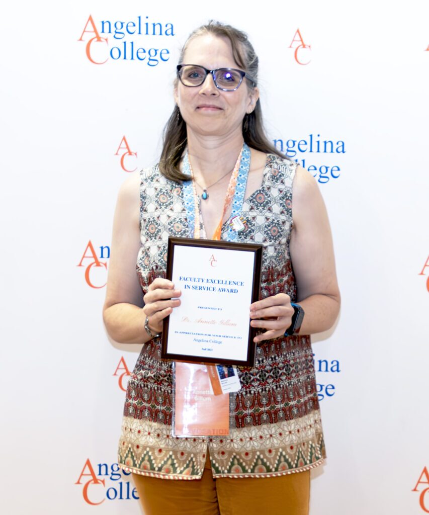 Angelina College’s Dr. Annette Gillum received the Faculty Excellence in Service Award during Tuesday’s Awards Luncheon held on the AC campus. (Jessica Deel Photo for AC News Service)