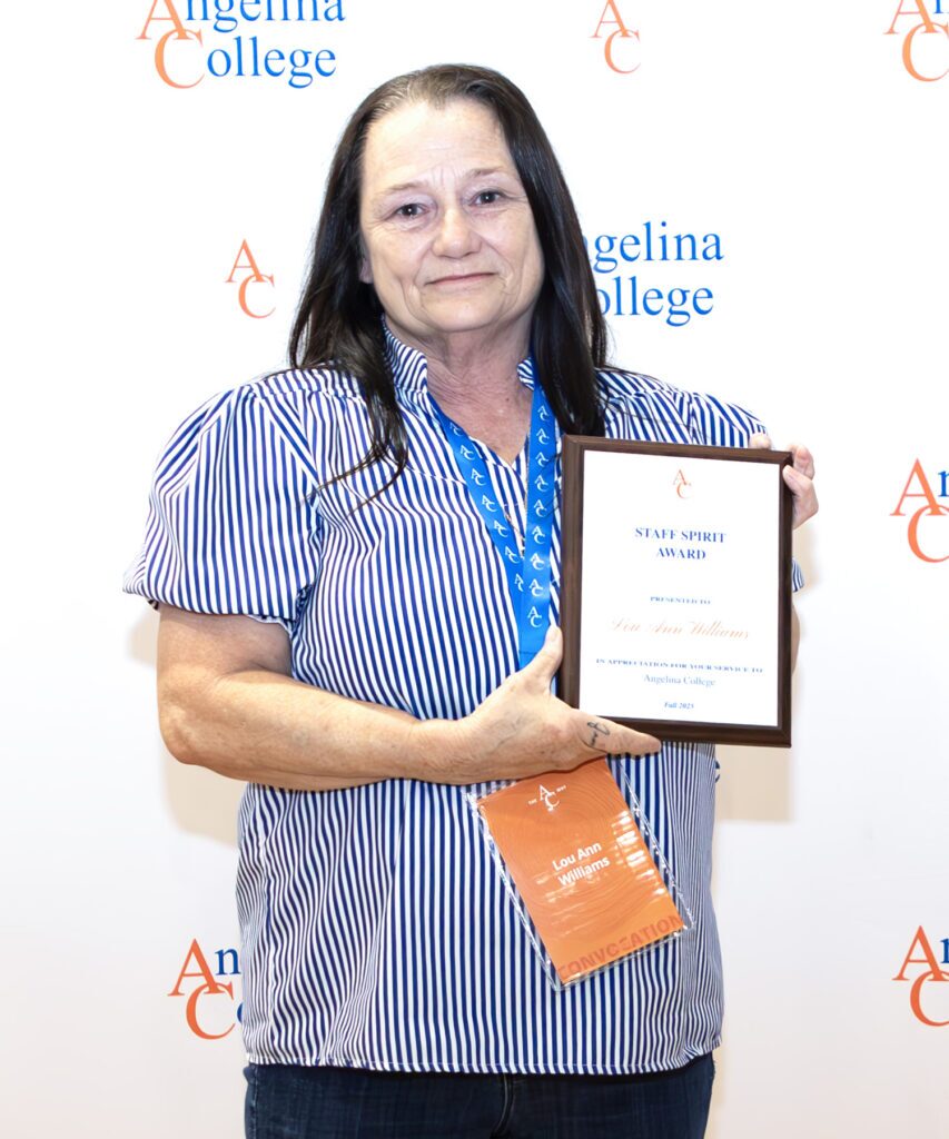 Angelina College’s Lou Ann Williams received the Spirit Award during Tuesday’s Awards Luncheon held on the AC campus. (Jessica Deel Photo for AC News Service)